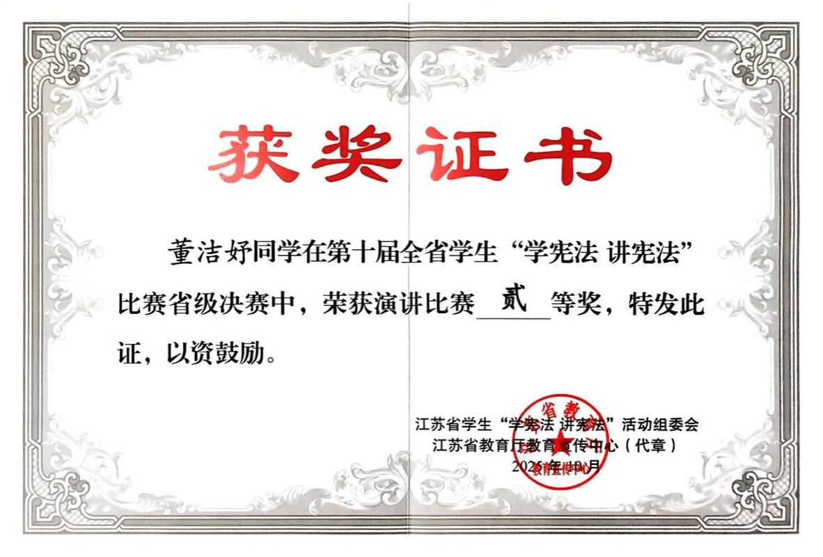近日,由江苏省教育厅主办,江苏省教育厅教育宣传中心承办,江苏警官学院协办的江苏省第十届全省学生“学宪法 讲宪法”比赛省级决赛在南京圆满闭幕。经过激烈角逐,我校语言文化学院24应用英语班董洁妤同学凭借稳定的现场发挥,荣获演讲比赛高校组二等奖,其指导教师吴霜获优秀指导教师奖。