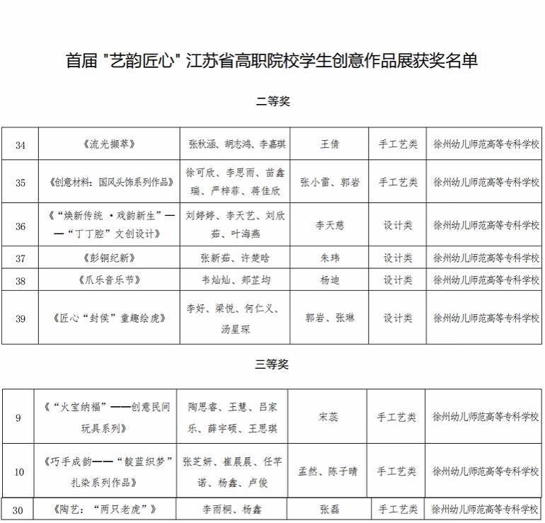 首届 “艺韵匠心” 江苏省高职院校学生创意作品展评选中,我校学子展现出扎实的专业基础与创新的设计思维,共斩获 6 项省级二等奖与 3 项省级三等奖,其中 6 组获二等奖的作品还受邀在徐州市艺术馆展出,进一步提升了我校在省内高职艺术教育领域的影响力。