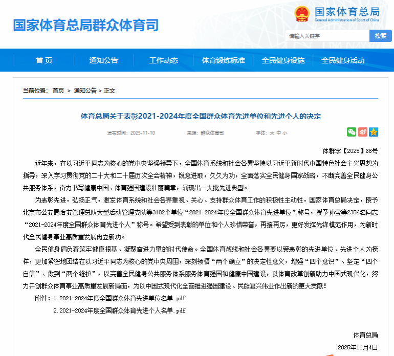 近日,国家体育总局公示2021—2024年度全国群众体育先进单位表彰名单,我校体育学院被授予“全国群众体育先进单位”称号。这一国家级荣誉,是国家对我校践行全民健身国家战略、推动群众体育事业发展的高度认可,也是我校全体师生凝心聚力、深耕实干的重要成果。