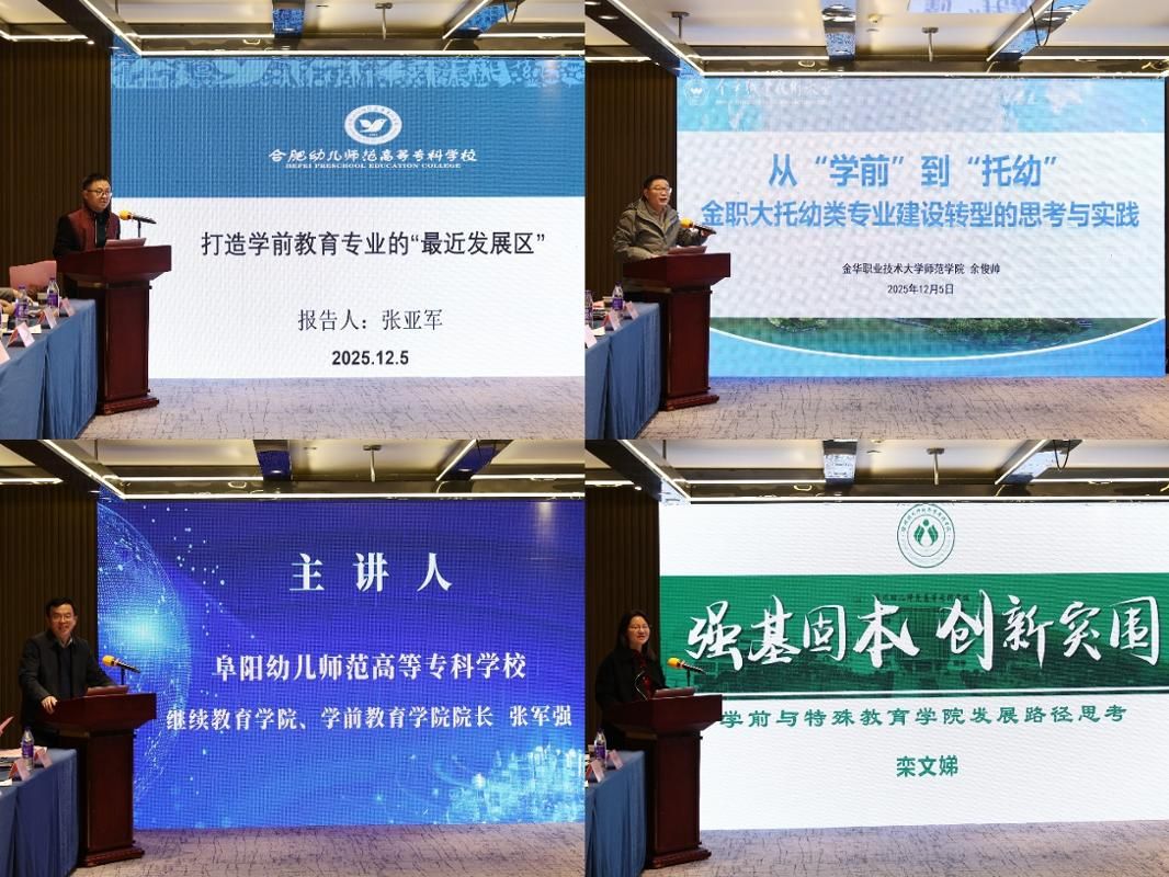 核心研讨环节聚焦“十五五期间学前教育专业发展路径”,四所代表性院校嘉宾分享前沿经验与实践思考。合肥幼儿师范高等专科学校学前教育系副主任张亚军以《打造学前教育专业的“最近发展区”》为题,结合全国及合肥地区师资需求数据,明确从规范培养向前瞻高质发展的转型方向,提出以临床式培养、专业集群建设、数智技术赋能为核心的发展路径;金华职业技术大学师范学院副院长余俊帅分享《金职大托幼类专业建设转型的思考与实践》,立足新生人口变化、国家政策导向及市场供需格局,系统分析托育行业人才需求态势,详细阐述托幼专业群从“学前”向“托幼”转型的实践路径,以“五金”建设为核心,通过园校协同、产教融合等模式构建托幼一体化培养体系,为同类院校转型提供了可复制的经验;阜阳幼儿师范高等专科学校学前教育学院院长张军强,聚焦少子化时代带来的行业挑战,从招生规模调控、师资结构转型、专业方向拓展等方面,提出兼具针对性与可行性的发展策略;我校学前与特殊教育学院院长栾文娣以“强基固本 创新突围”为主题,围绕发展根基、进阶瓶颈、突破路径三大维度,提出以党建赋能、专业优化、产教融合深化为核心的发展思路。嘉宾们的分享兼具实践深度与前瞻视野,为联盟“十五五”规划制定提供了重要参考。