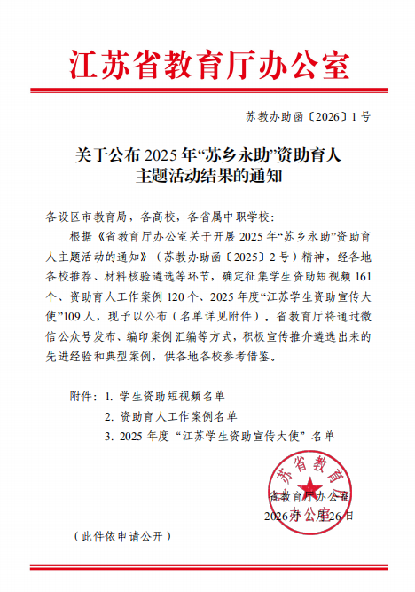 近日,江苏省教育厅办公室发布《关于公布2025年“苏乡永助”资助育人主题活动结果的通知》(苏教办助函〔2026〕1号),我校在本次活动中荣获多项荣誉。其中,学前与特殊教育学院短视频作品《太阳——一对内地西藏班母女的教育“接力”》、体育学院短视频作品《扶摇借力,志在青云》分别入选“学生资助短视频名单”;体育学院24级体育教育2班夏子钦同学获评2025年度“江苏学生资助宣传大使”。