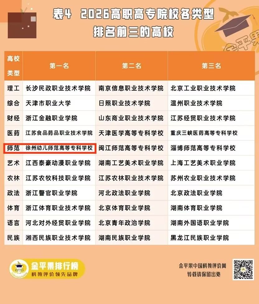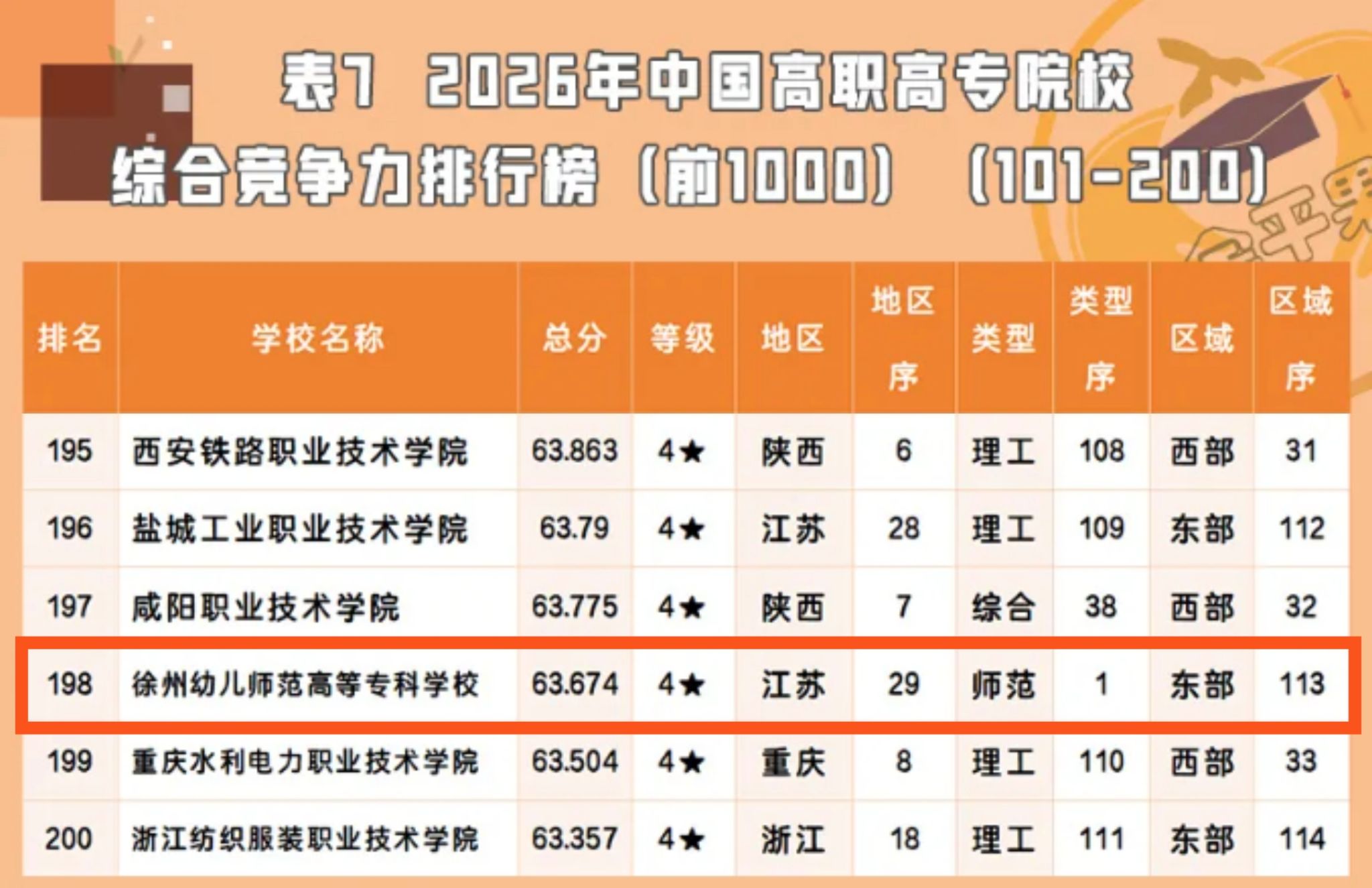 近日,“金平果”2026版中国高职院校竞争力排行榜正式发布。在对全国1554所高职高专院校进行的综合评价中,我校以全国第198名的综合排名再创新高,较2025年的第255名大幅跃升57个位次,首次进入全国前两百强。同时,学校连续四年蝉联高职高专师范类院校榜首,持续九年稳居全国幼专首位,展现出强劲的办学实力和持续向好的发展态势。